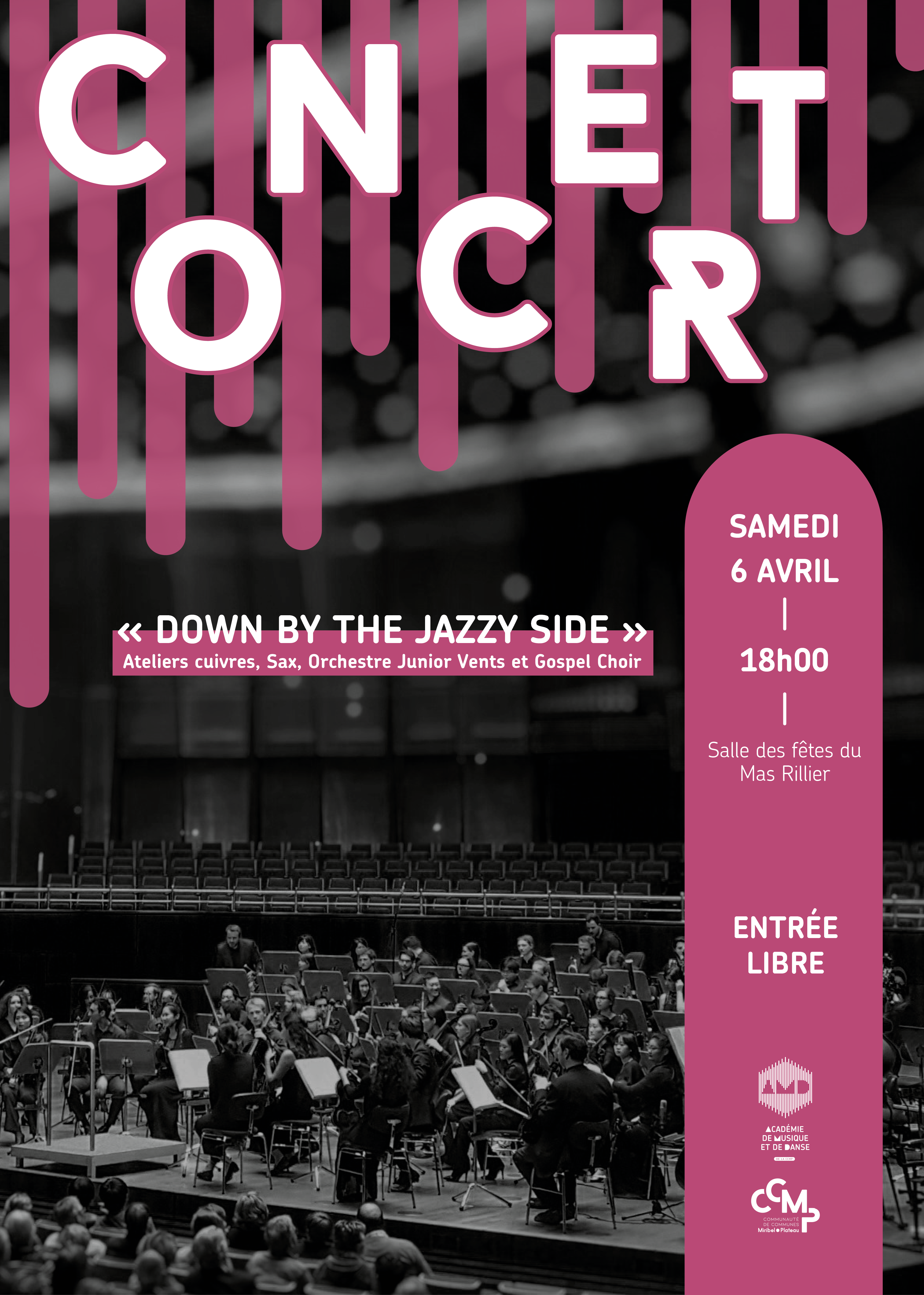 Samedi 6 avril 2024 à 18h, venez assister au Concert « Down By The Jazzy Side » avec l’orchestre junior vents, l’ensemble Brass & Fracass et le Gospel Choir
