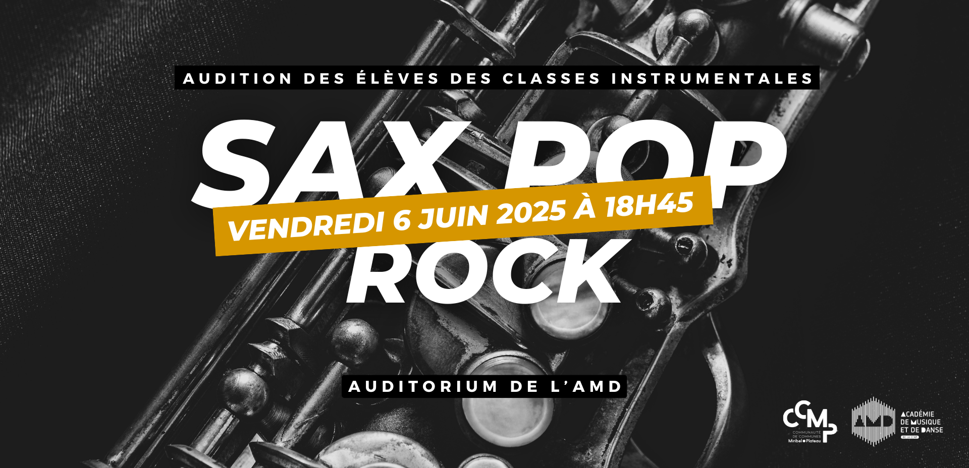 Vendredi 6 juin 2025 à 18h45, venez assister à un concert « Sax Pop Rock » avec les élèves de la classe de saxophone et l’atelier pop rock.
